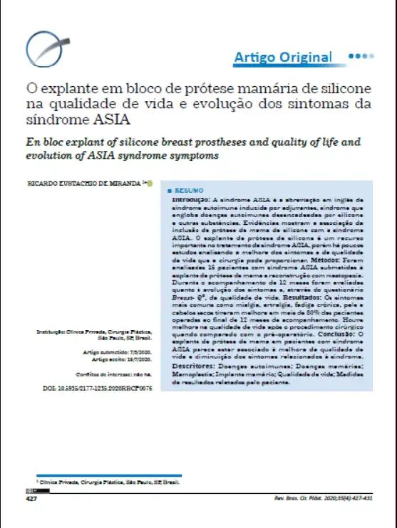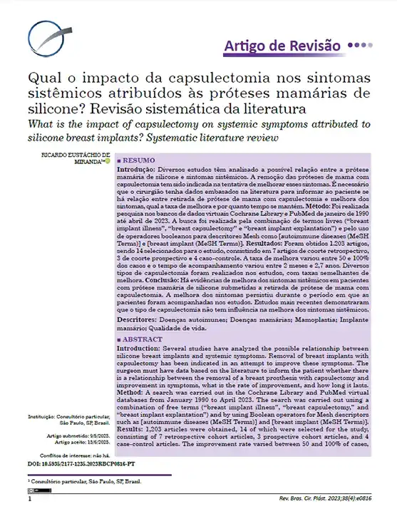 Publiquei um artigo na Revista Brasileira de Cirurgia Plástica revisando a literatura médica para entender qual o impacto da capsulectomia (retirada da cápsula e prótese de mama) nos sintomas sistêmicos relatados pelas pacientes.